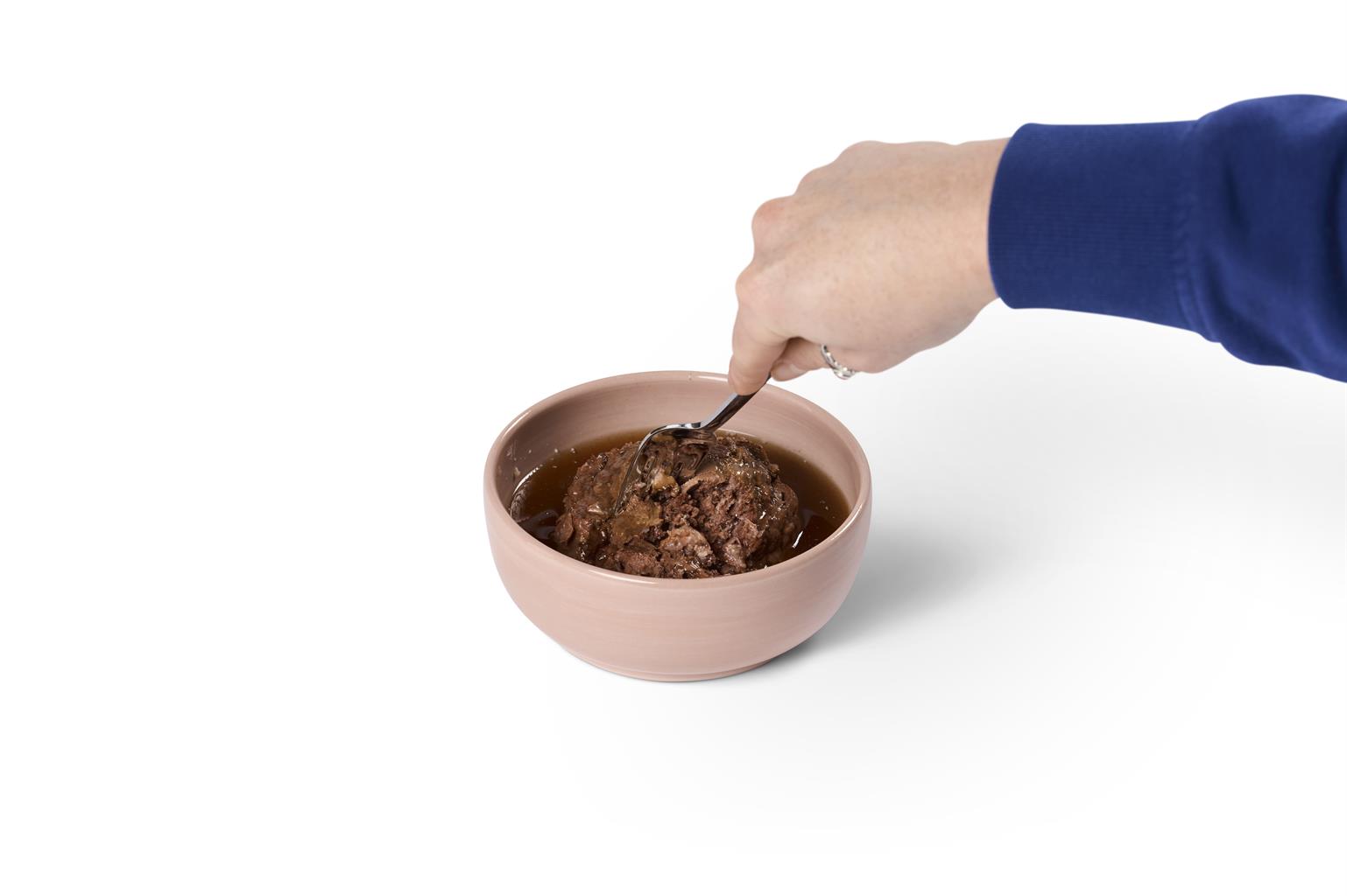 Versez tout le contenu dans un récipient, mélangez soigneusement le liquide avec le noyau de viande, puis préparez la portion souhaitée pour votre animal.